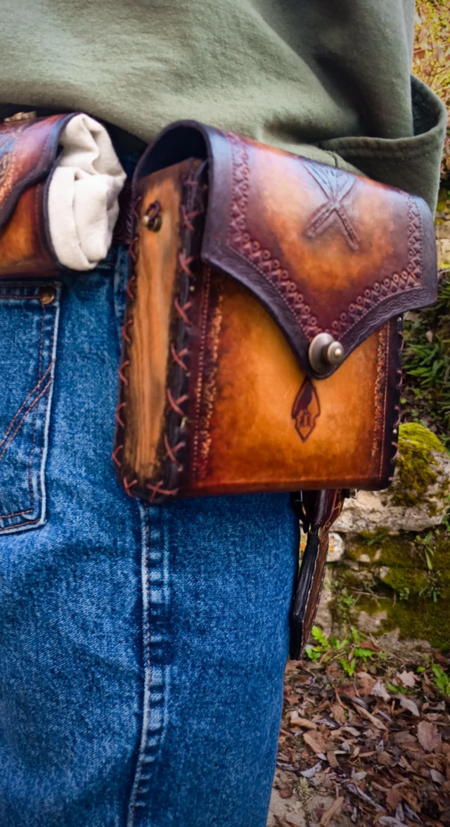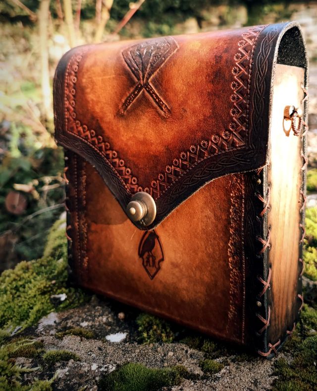 À sa ceinture pend une sacoche, taillée dans la première branche tombée du grand Frêne Yggdrasil et tannée avec la sagesse des runes. De temps à autre, le Pèlerin laissait derrière lui cet Essentiel comme un gage ou une récompense.